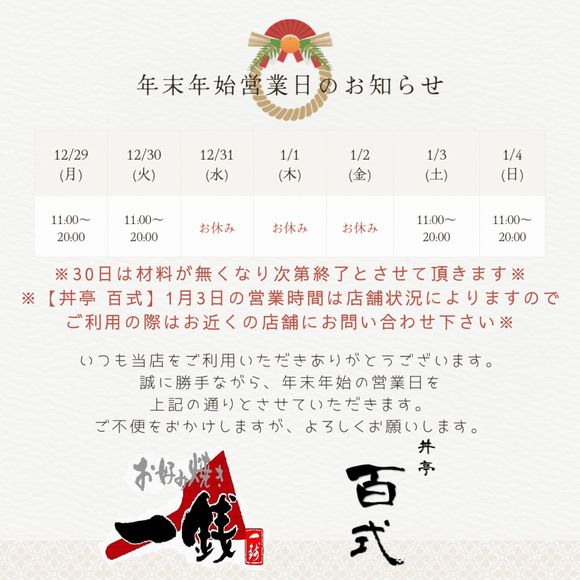 <更新履歴> 2025/11/1 ★レギュラーメニュー更新★※新商品【将軍焼】登場※ 2025/5/1 ☆レギュラーメニュー更新☆ 2024/1/3 ★レギュラーメニュー更新★ 2023/12/23 年末年始営業のお知らせ♪ 2023/9/1 ☆店舗情報更新☆ ※定休日変更※ 2023/4/1 ★レギュラーメニュー更新★ ※営業時間変更※ 2022/4/1 ☆レギュラーメニュー更新☆ ※営業時間変更※ 2021/12/21 年末年始営業のお知らせ♪ 2021/11/1 ★冬・期間限定メニュー更新★ 2020/11/25★冬・期間限定メニュー更新★ 2020/3/2 ♪春・期間限定メニュー更新♪ 2019/12/23 *年末年始営業のお知らせ* 2019/12/6 ★冬・期間限定メニュー更新★ 2019/9/9 ☆秋・期間限定メニュー更新☆ 2019/7/1 ★夏・期間限定メニュー更新★ 2019/4/1 ☆価格改定後のメニュー更新☆ 2019/3/1 ※価格改定のお知らせ※ 2018/12/25 年末年始営業のお知らせ♪ 2018/11/5 ホルモン焼、広島カキお好み焼き復活登場! 2018/7/1 清涼焼、カルビ焼き復活登場!! 2017/12/22 年末年始営業のお知らせ 2017/11/13 ホルモン焼、広島カキお好み焼き復活! 2017/10/30 創業14周年キャンペーン終了 2017/6/25 創業14周年キャンペーン 2017/3/1 カレーお好み焼き新登場♪ 2016/12/1 新商品 ホルモン焼き、広島カキお好み焼き登場!! 2016/11/1 ホームページ公開